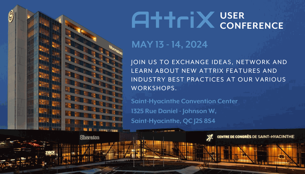 Conférence Utilisateurs AttriX! Cet événement représente une opportunité unique pour vous de découvrir nos dernières innovations, participer à des ateliers enrichissants et de réseauter avec des professionnels de votre secteur. Utilisez le lien dans le menu ci-haut pour vous inscrire à la conférence.